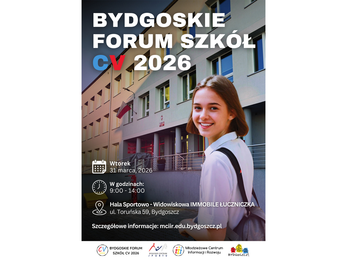 Bydgoskie Forum Szkół CV 2026 wstępnie zaplanowane jest na dzień 31.03.2026r. Miejsce wydarzenia: Hala Sportowo-Widowiskowa "Immobile Łuczniczka" ul. Toruńska 59, Bydgoszcz Wydarzenie jest bezpłatne i adresowane przede wszystkim do uczniów klas VII i VIII szkół podstawowych z Bydgoszczy i z regionu kujawsko - pomorskiego, którzy stoją przed podjęciem decyzji o wyborze szkoły ponadpodstawowej. Bydgoskie szkoły ponadpodstawowe – ogólnokształcące i techniczne przedstawią na Forum swoją ofertę edukacyjną w ciekawej formie.