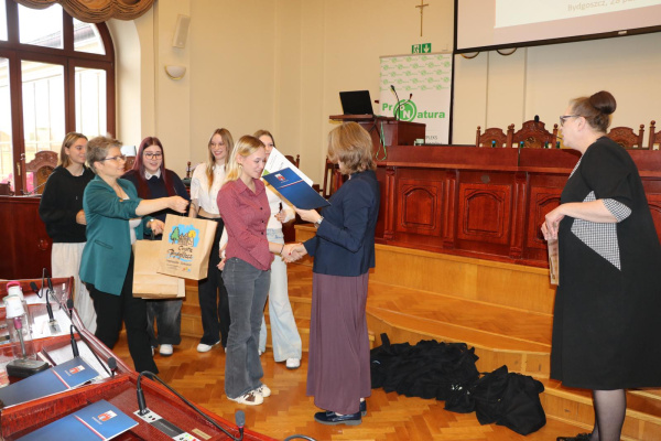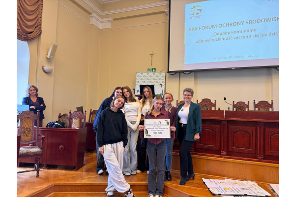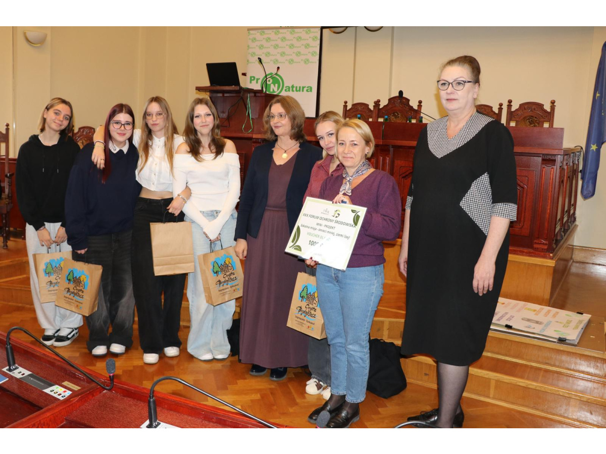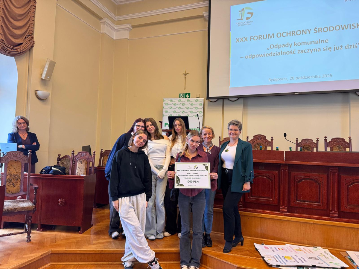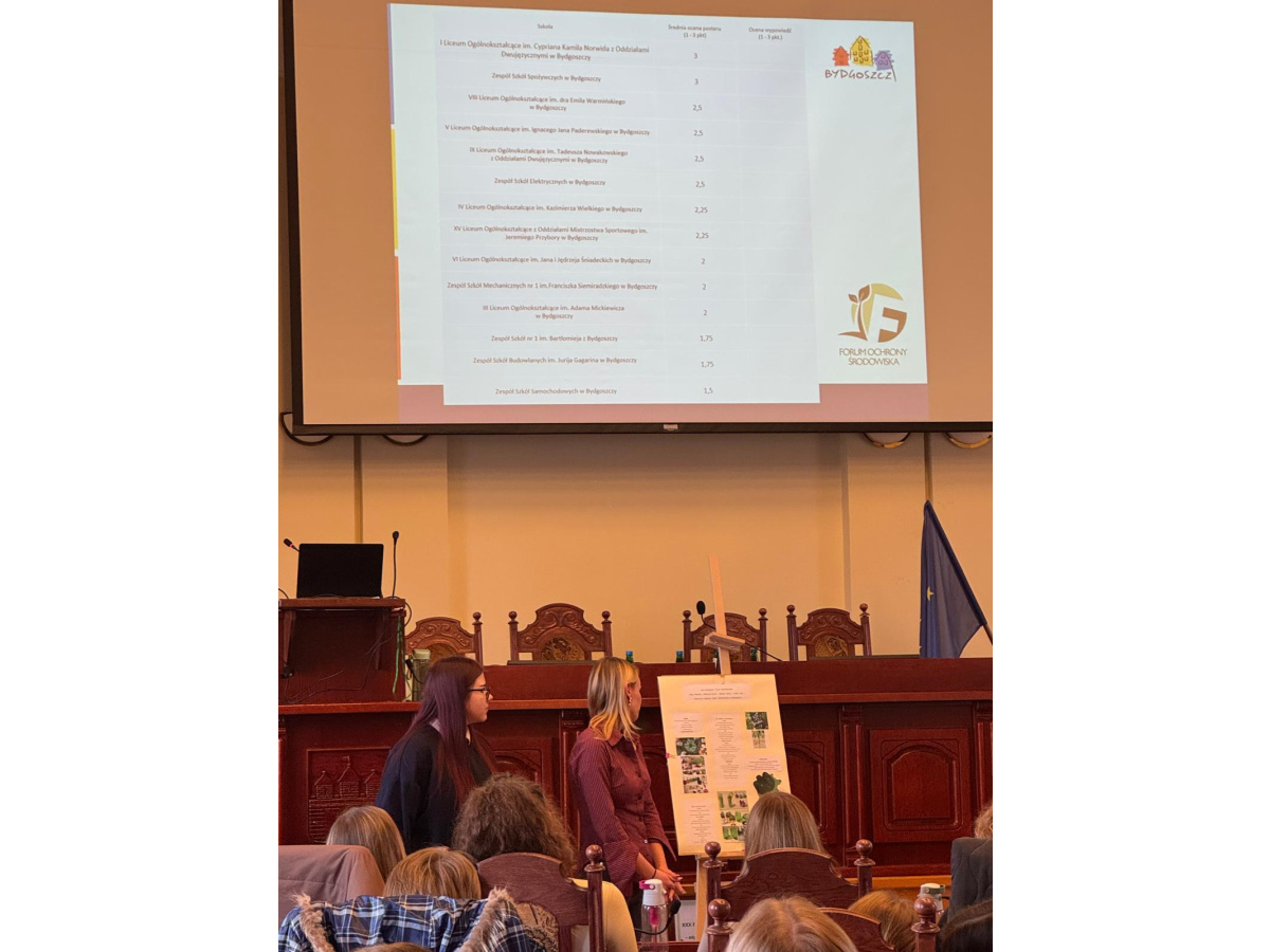 28.10. 2025 r. w Sali Sesyjnej Ratusza odbyło się XXX Forum Ochrony Środowiska organizowane przez Wydział Ochrony Środowiska UM Bydgoszczy, w którym wzięli udział uczniowie kilkunastu szkół ponadpodstawowych z Bydgoszczy. Naszą szkołę reprezentowały uczennice klasy 4 Lp2 – Mariia Chepurniak, Sylwia Kaczmarek, Marta Kalinowska, Marika Kozłowska oraz Adrianna Rogoś z opiekunem Magdaleną Gminska.
