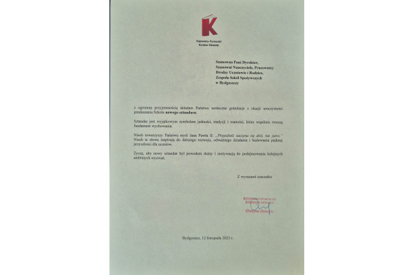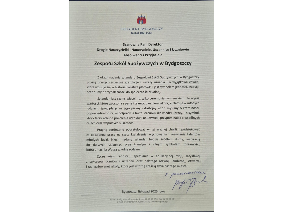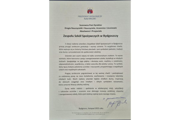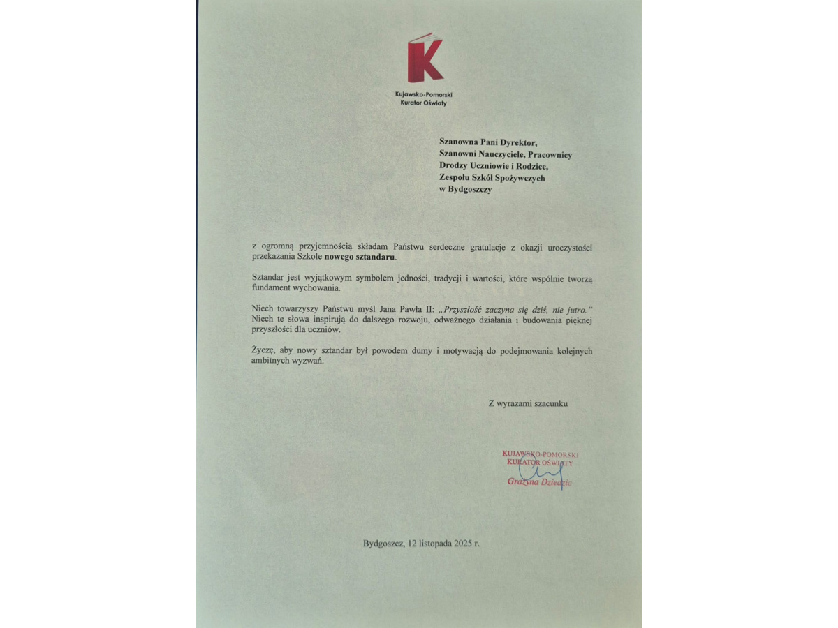 W środę, 12 listopada, w Zespole Szkół Spożywczych w Bydgoszczy odbyła się wyjątkowa uroczystość nadania nowego sztandaru – symbolu tradycji, jedności oraz dumy całej szkolnej społeczności.
